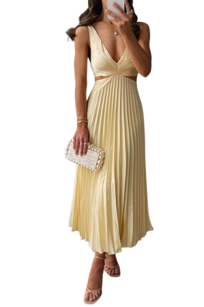 Elévate tu estilo con el vestido Laia. Abraza la elegancia y la sofisticación con el vestido Gala. Con un favorecedor escote en v y una falda plisada, este vestido satinado está diseñado para que destaques en cualquier evento. Captura todas las miradas con el vestido Gala. El elegante detalle de cintura recortada y el hermoso diseño plisado crean un look sofisticado perfecto para cualquier ocasión.