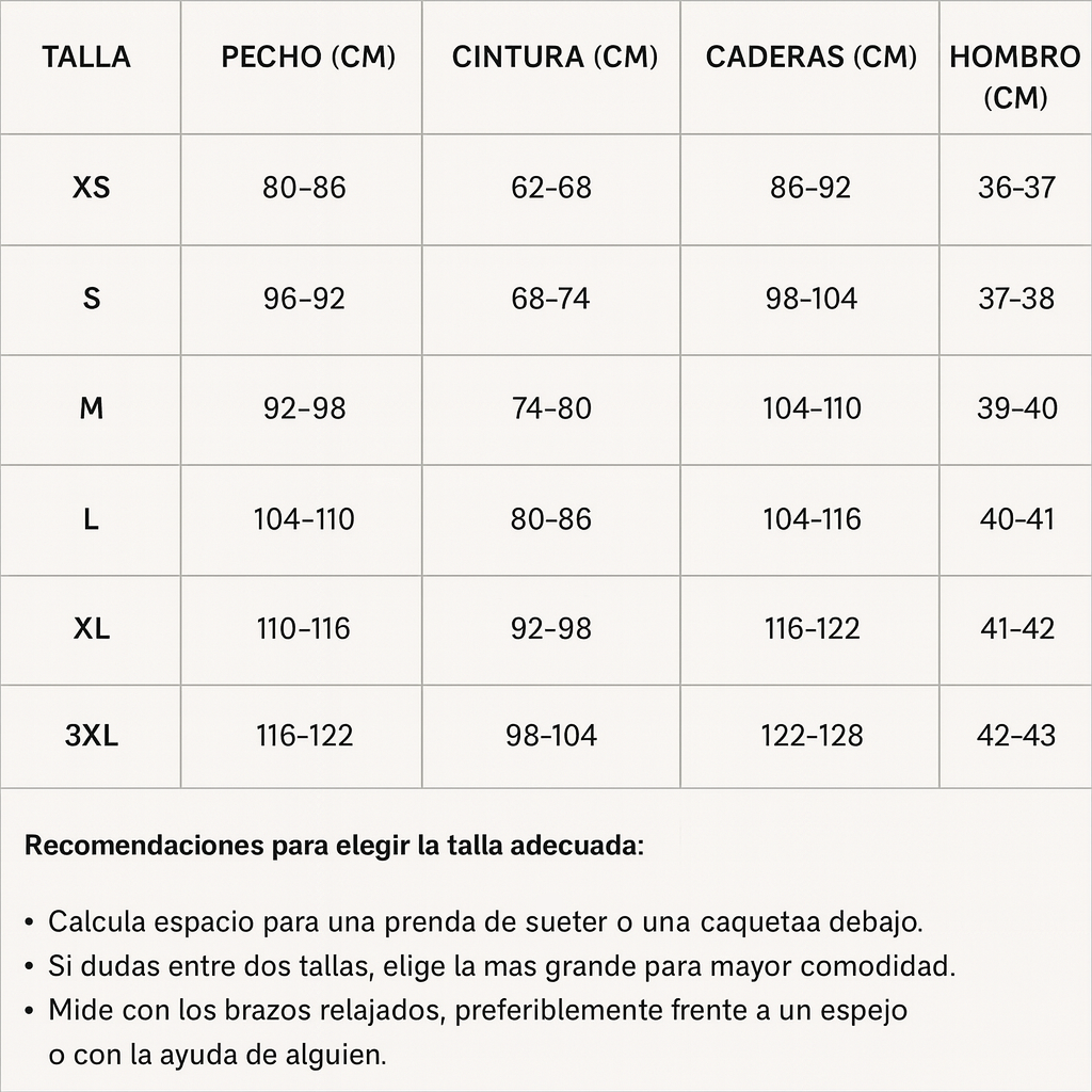 | Talla | EU | Pecho | Cintura | Cadera | Hombros |